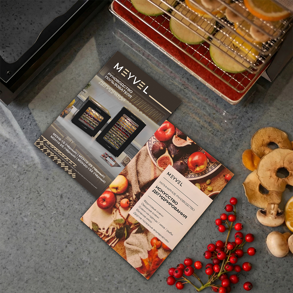 Meyvel MDH20-1S2 (Чёрный) (Black) — это современный дегидратор, который создан для тех, кто хочет заготавливать фрукты, овощи, мясо, травы и ягоды без потери их вкуса и пользы круглый год. Прочный корпус, продуманная конструкция и умная электроника превращают его в надёжного помощника на каждый сезон.