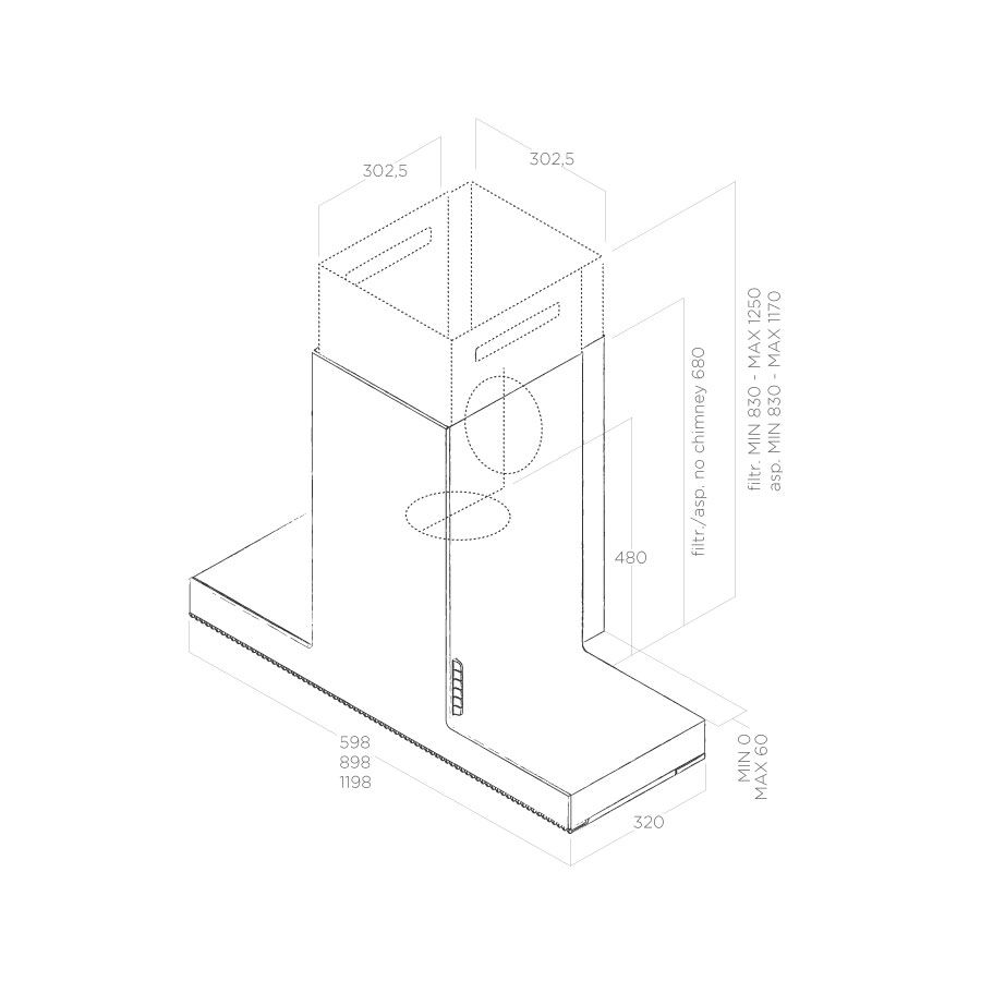 - Возможность установки, в вытяжной или фильтрующей версии, без верхнего дымохода, при условии нахождения на высоте 680 мм