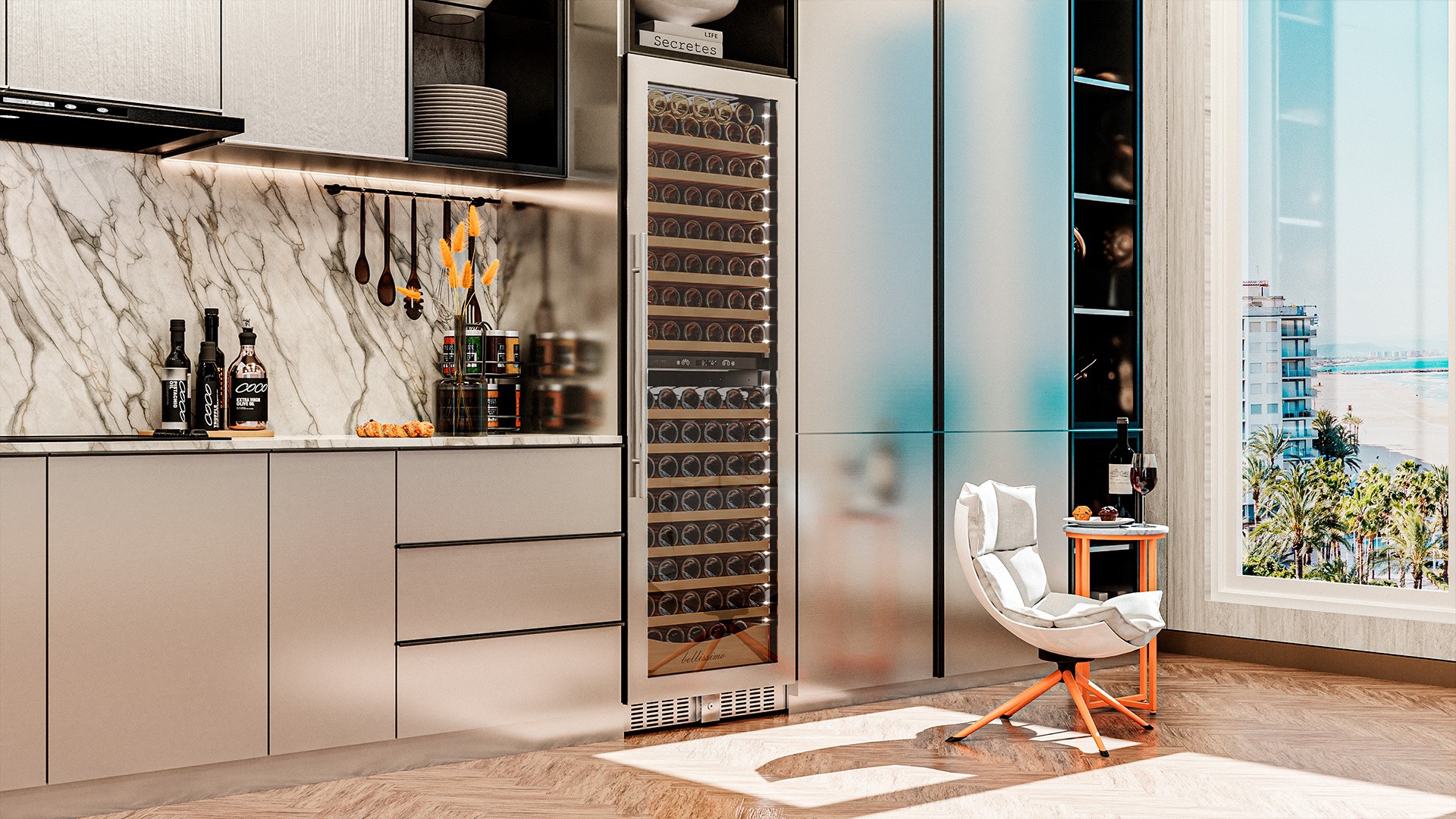 Винный шкаф предназначен для профессионального и длительного хранения различных сортов вин (до 174 бутылок типа Бордо). Он так же оснащен дверью с защитой от ультрафиолетовых лучей и поддерживает влажность в диапазоне 60-80%, как в настоящем винном погребе.